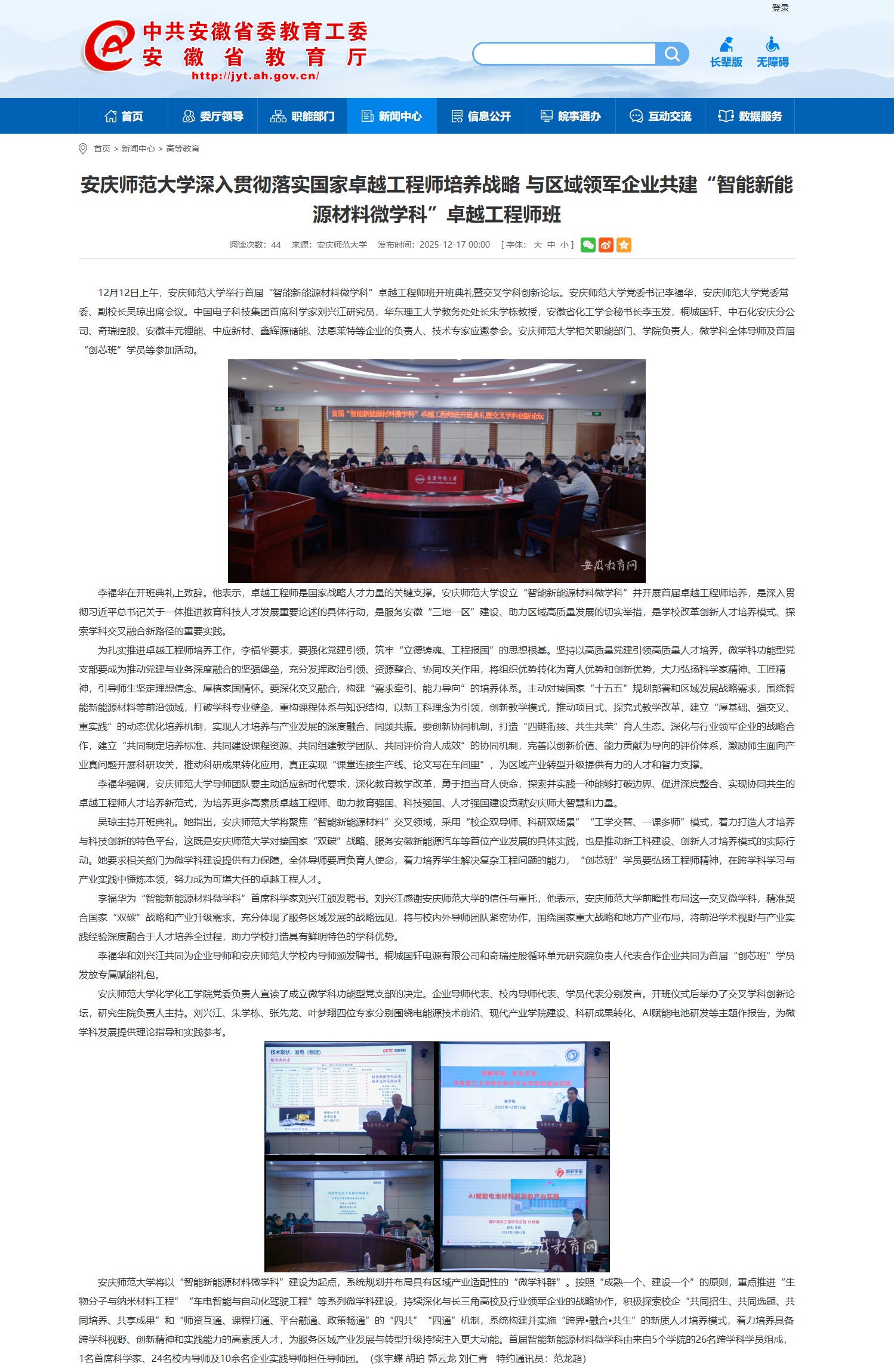 【安徽教育网】安庆师范大学深入贯彻落实国家卓越工程师培养战略 与区域领军企业共建“智能新能源材料微学科”卓越工程师班https://jyt.ah.gov.cn/xwzx/gdjy/40776797.html