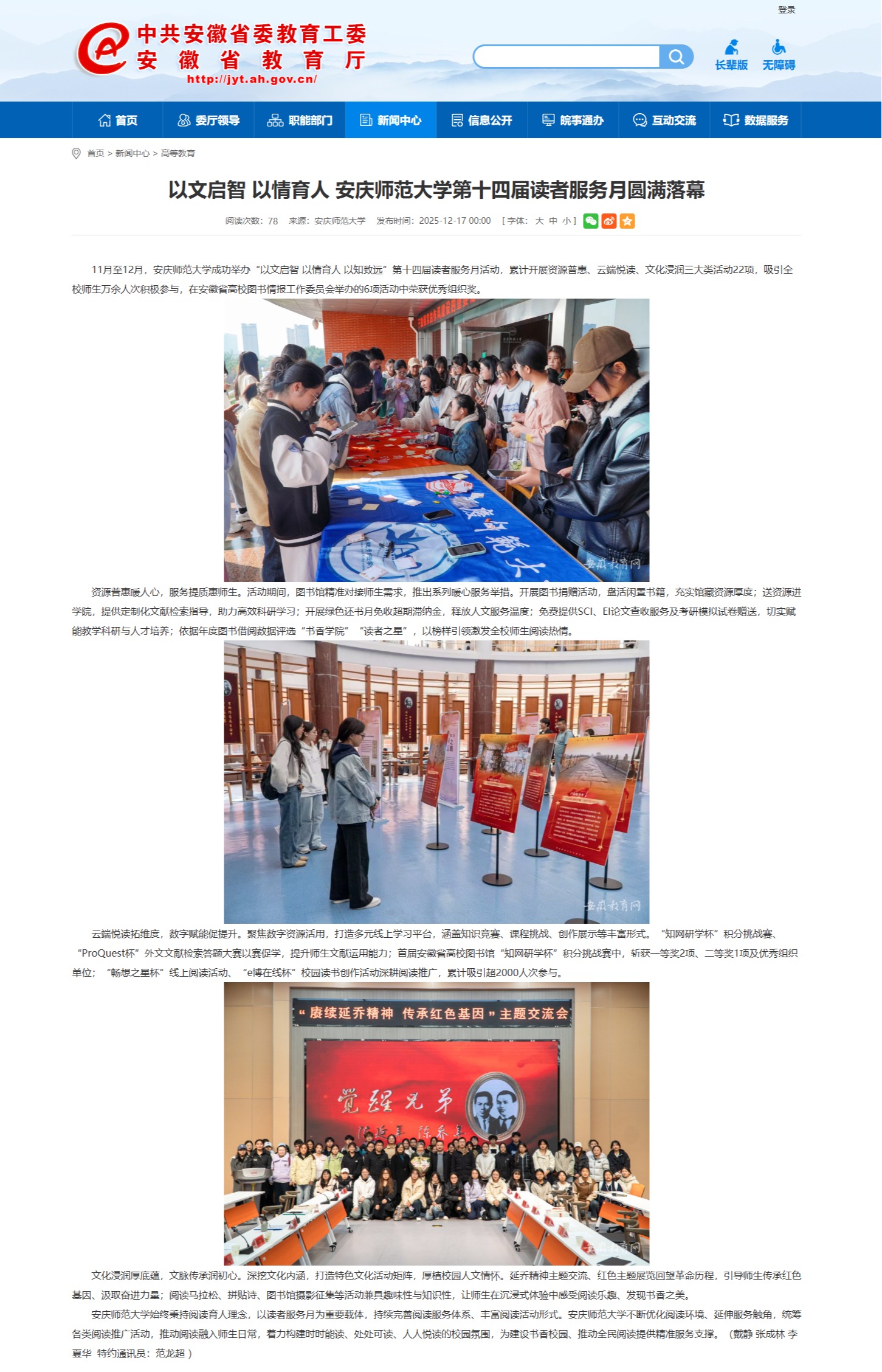 【安徽教育网】以文启智 以情育人 安庆师范大学第十四届读者服务月圆满落幕https://jyt.ah.gov.cn/xwzx/gdjy/40776782.html