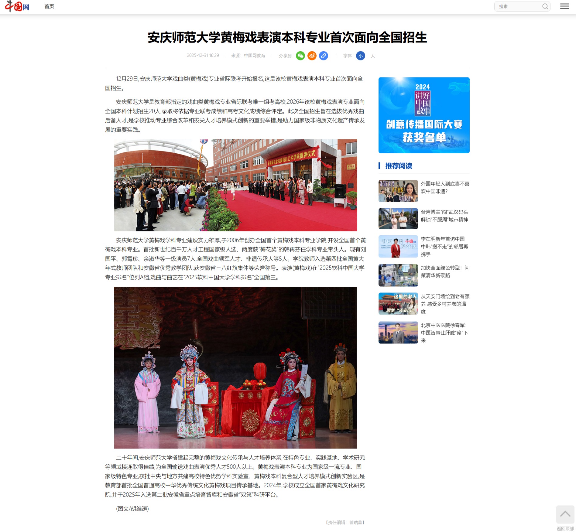 【中国网】安庆师范大学黄梅戏表演本科专业首次面向全国招生http://edu.china.com.cn/2025-12/31/content_118256010.shtml