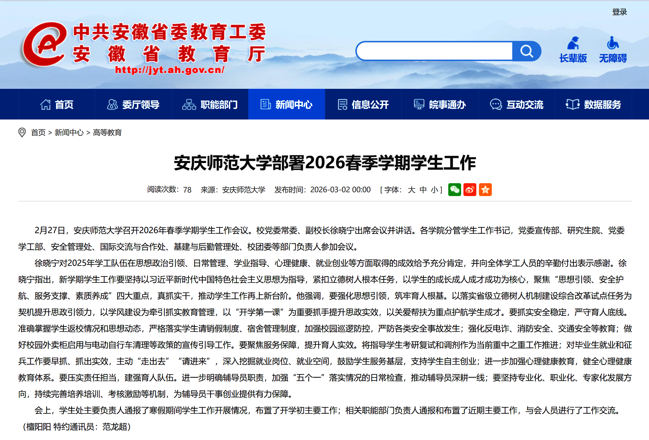 【安徽教育网】安庆师范大学部署2026春季学期学生工作https://jyt.ah.gov.cn/xwzx/gdjy/40782658.html
