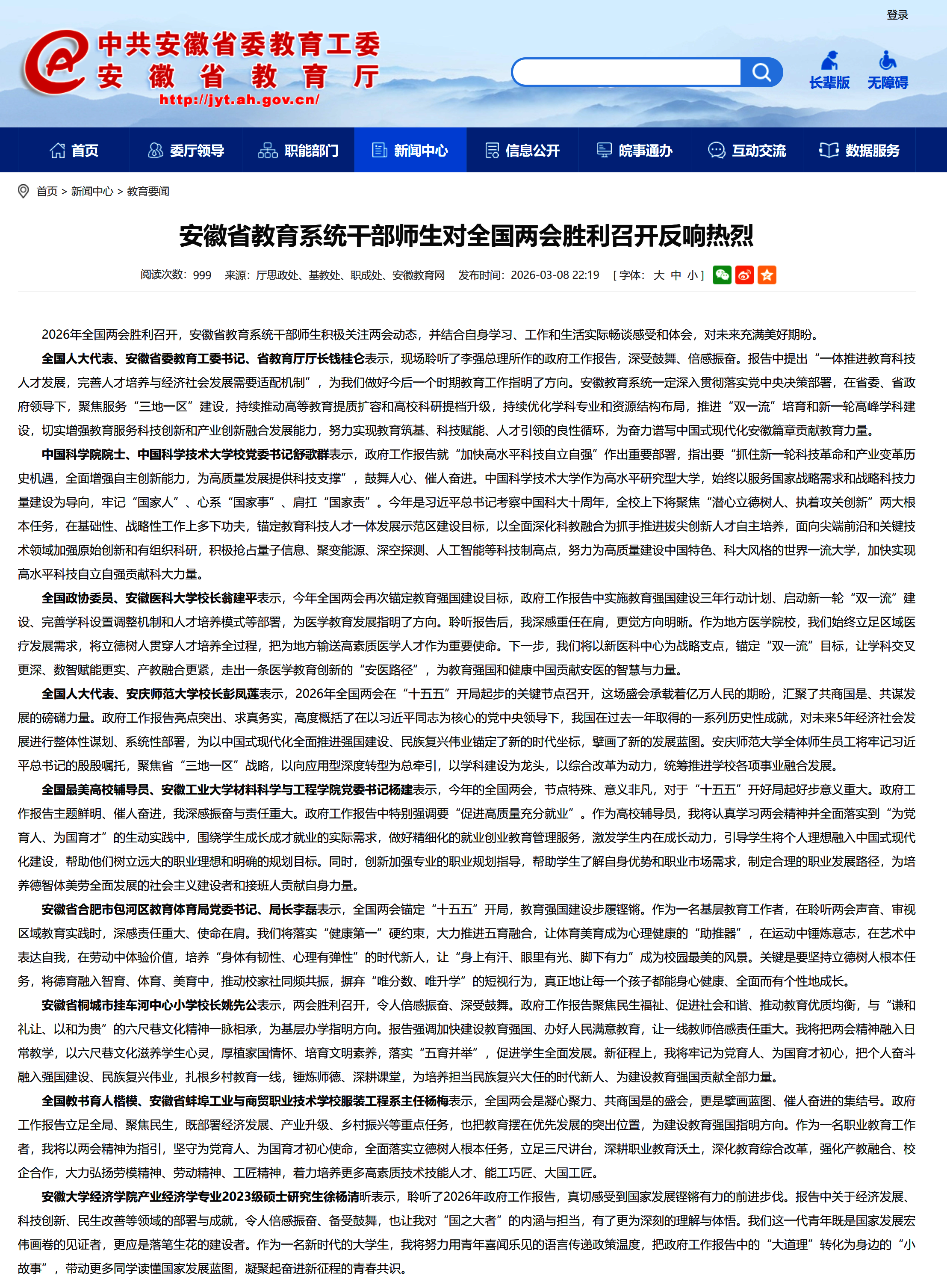 【安徽新闻网】安徽省教育系统干部师生对全国两会胜利召开反响热烈https://jyt.ah.gov.cn/xwzx/jyyw/40783345.html