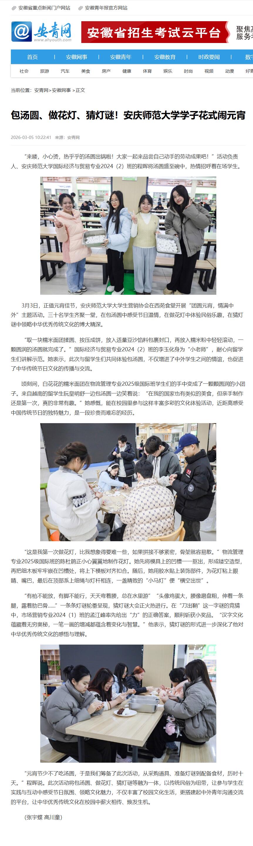 来源:【安青网】包汤圆、做花灯、猜灯谜!安庆师范大学学子花式闹元宵https://www.ahyouth.com/news/20260305/1778214.shtml