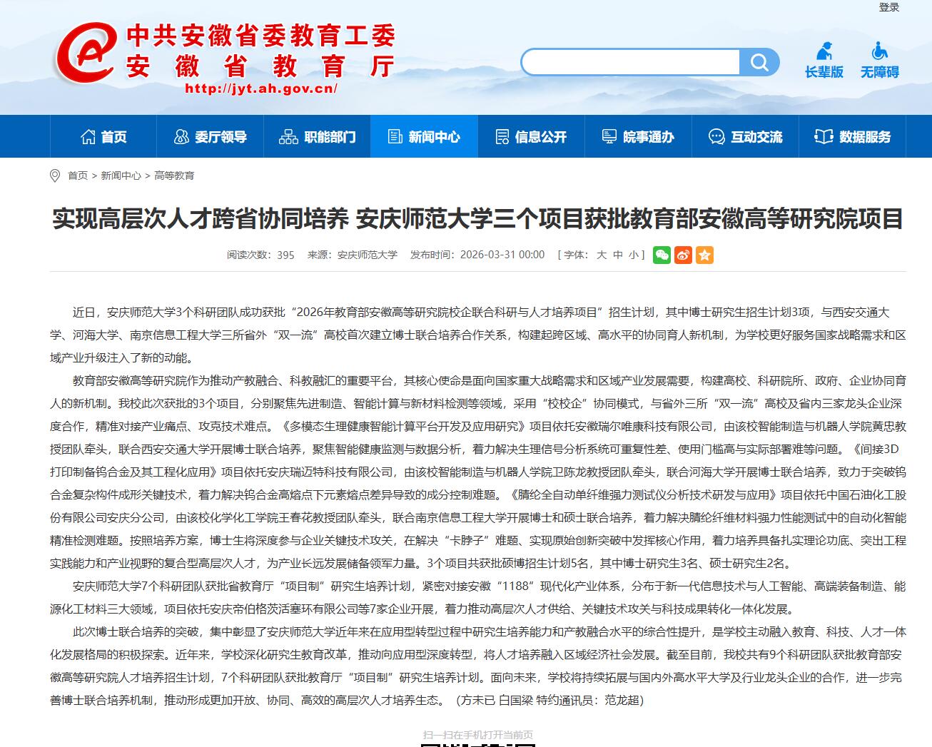 来源:【安徽教育网】实现高层次人才跨省协同培养 安庆师范大学三个项目获批教育部安徽高等研究院项目https://jyt.ah.gov.cn/xwzx/gdjy/40785890.html