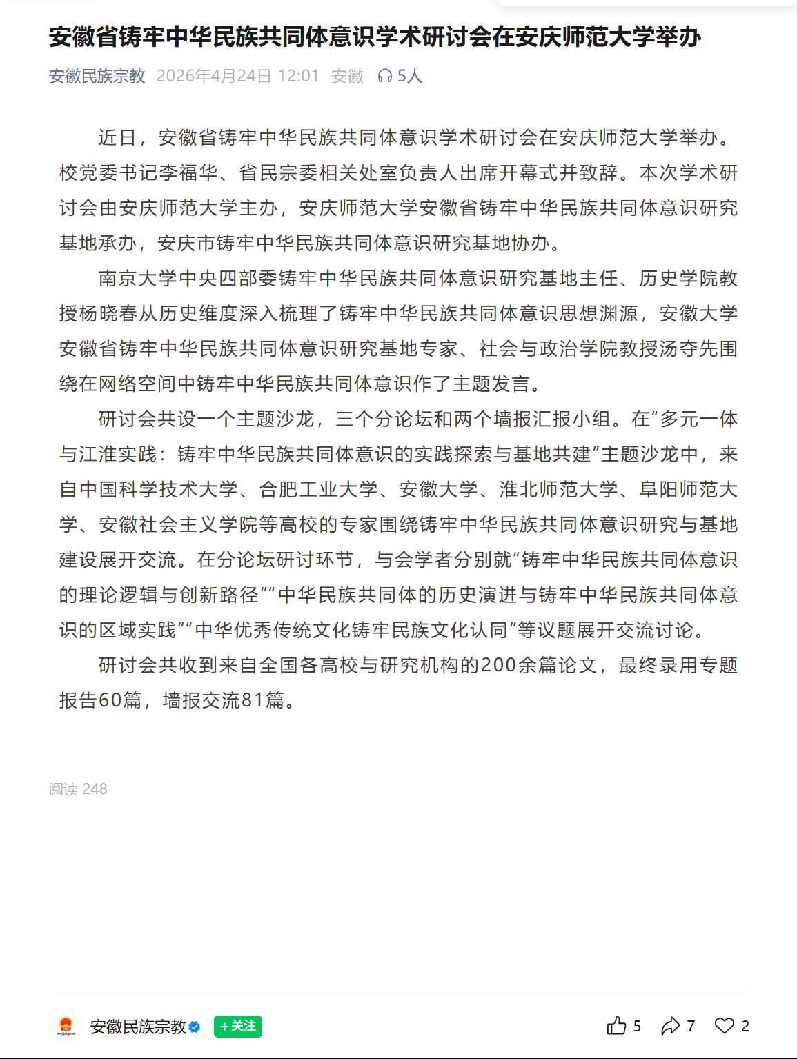 来源:【安徽民族宗教】安徽省铸牢中华民族共同体意识学术研讨会在安庆师范大学举办https://mp.weixin.qq.com/s/b7Vfo3FgguuM1n9cvfFCEQ
