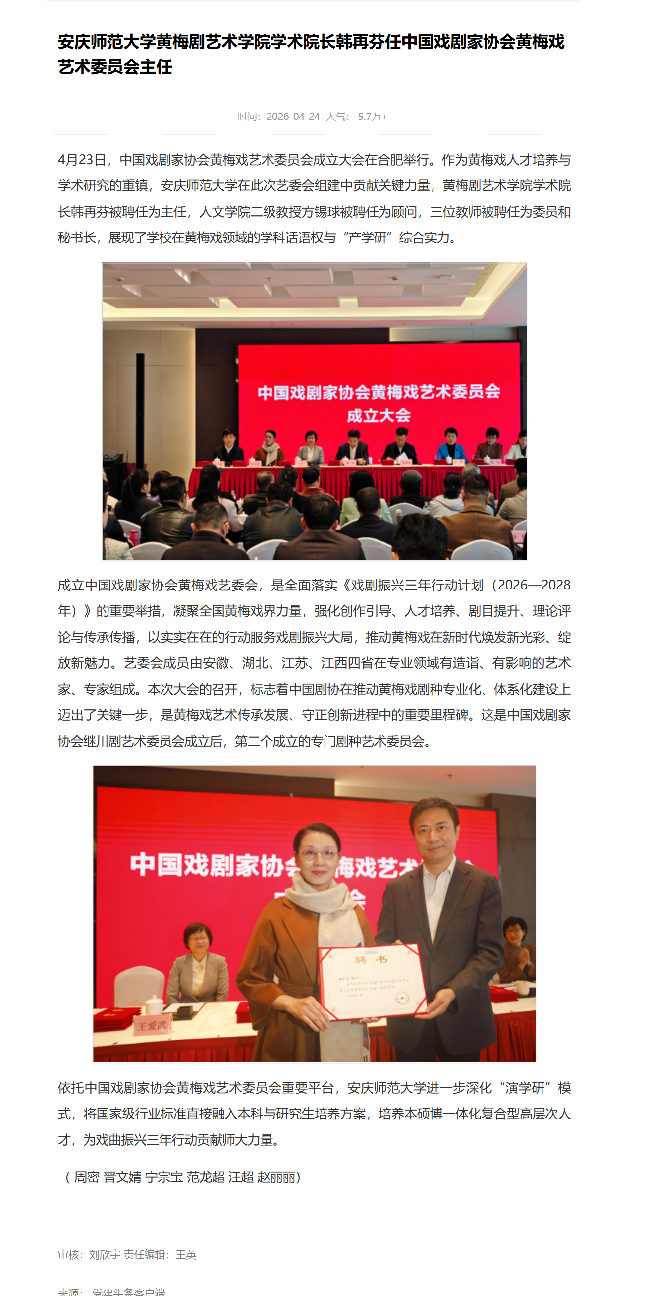 来源:【党建头条】安庆师范大学黄梅剧艺术学院学术院长韩再芬任中国戏剧家协会黄梅戏艺术委员会主任https://www.djttw.com/m/view.php?aid=1068364