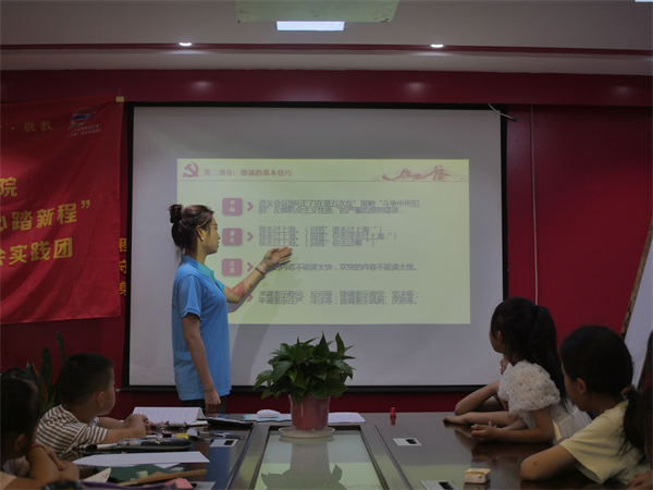 实践团队长、翻译专业2021(2)班的李文博表示,团队准备了拼红色记忆、红色朗诵等课程,以孩子们学过的爱国主题课文为切入点,引导孩子们积极学习党的创新理论。
